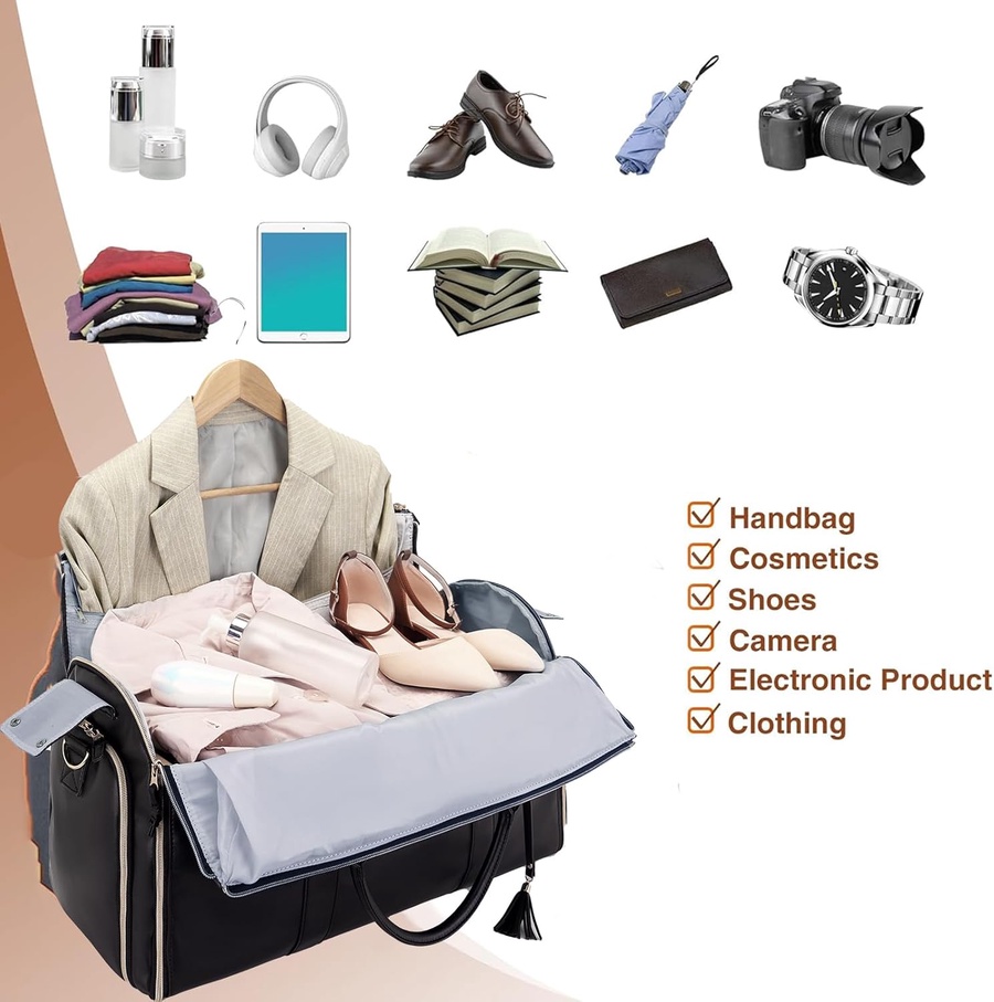 بتشيل كل احتياجاتك: لبس، أحذية، أدوات تجميل، باسبور، موبايل، ومستلزماتك الشخصية بكل سهولة.
